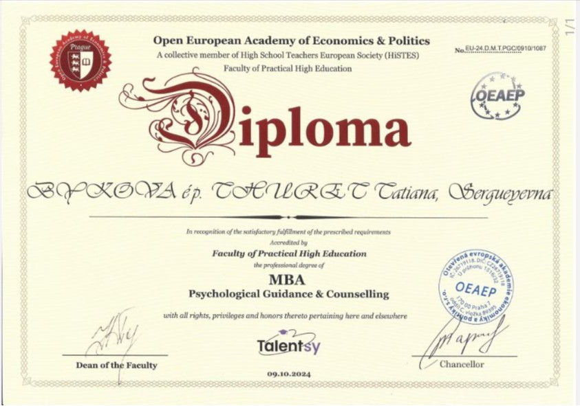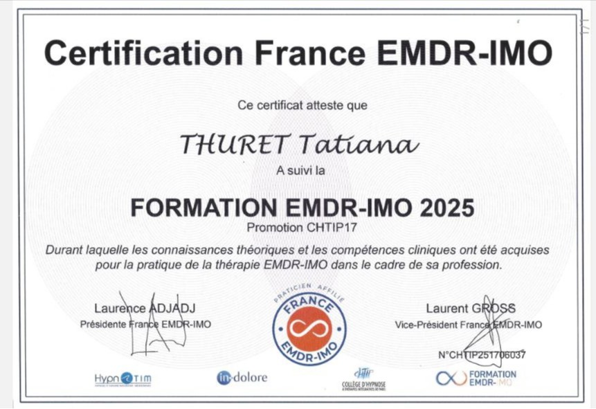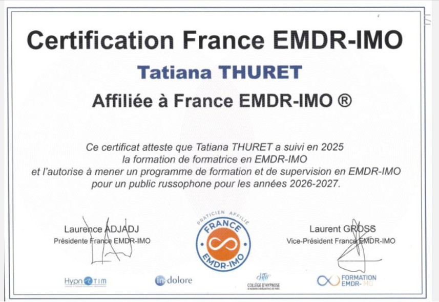 Международная сертификация на ведение практики по методу десенсибилизации и переработки движениями глаз, Institute EMDR-IMO France (Париж).